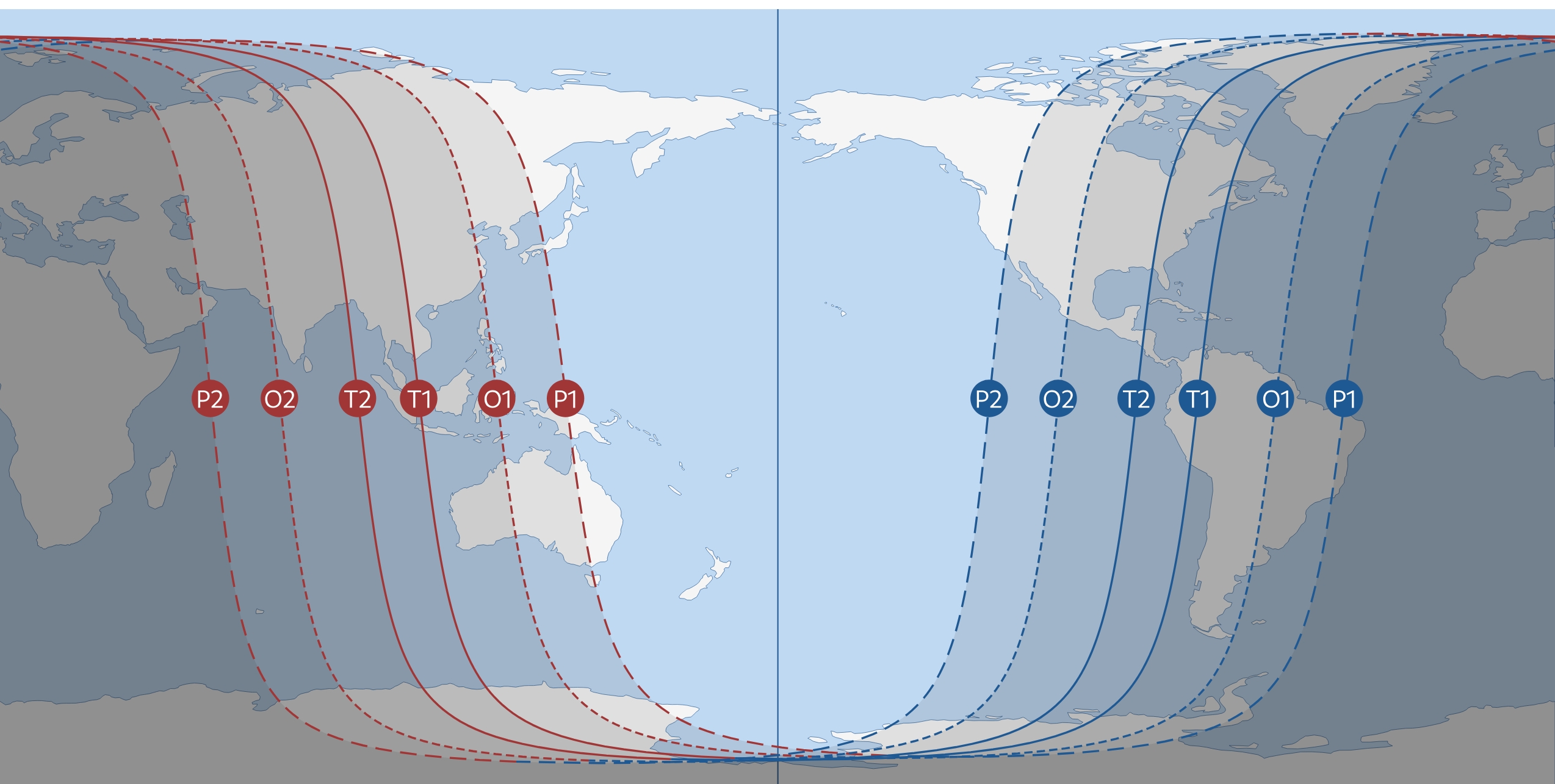 - Sortie de la pénombre (P2) : instant du dernier contact extérieur avec le cône de pénombre (grands pointillés).