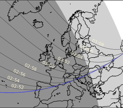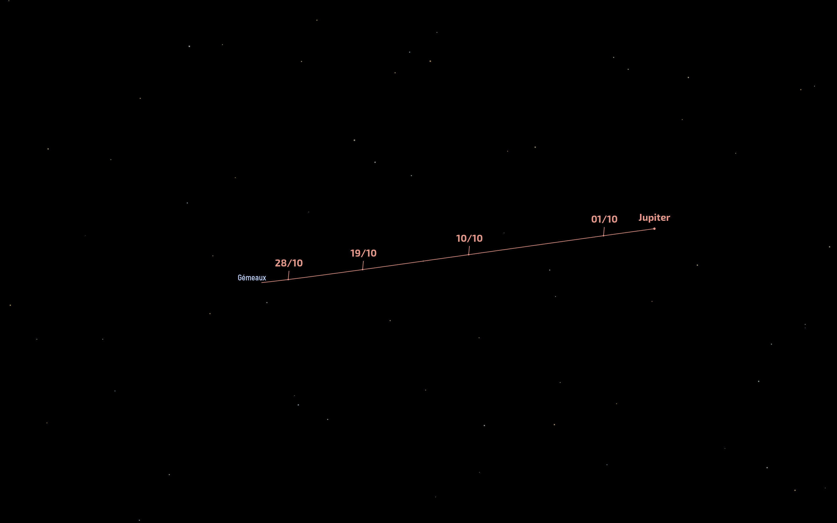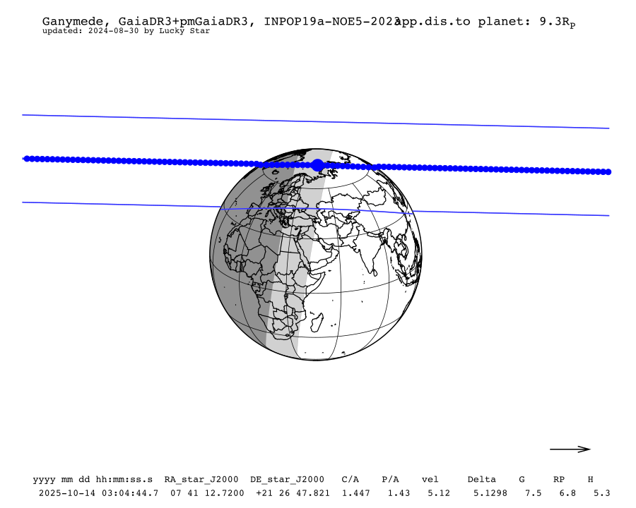 Pour Jupiter, le spectacle aura lieu sur le disque de la planète. Les deux satellites galiléens Io et Europe vont y projeter leur ombre. Le premier phénomène aura lieu dans la nuit du 14 au 15 octobre 2025. Lorsque la planète géante va se lever au-dessus de l'horizon nord-est dans les Gémeaux, vers 23 15min UTC, le phénomène sera en cours puisque les deux ombres seront bien visibles au milieu du disque de la planète.