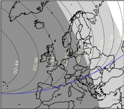 Le premier contact de l’occultation aura lieu à 21 h 30 min 21 s UTC soit vers 23 h 30 min TLF. L’occultation durera 3 minutes. Rhéa va passer derrière Thétys.